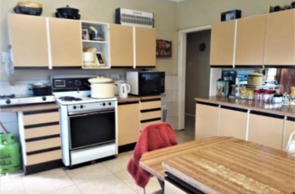 Spacious kitchen with lots of cupboards, a stove, and an oven.