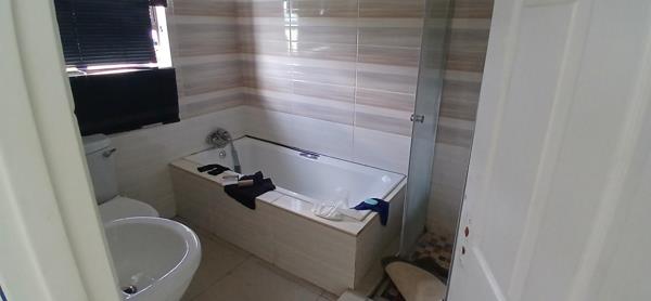 The en-suite bathroom has a bath, a shower, a toilet, and a hand basin.