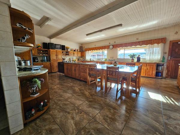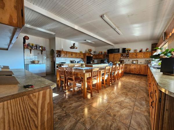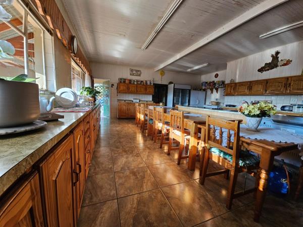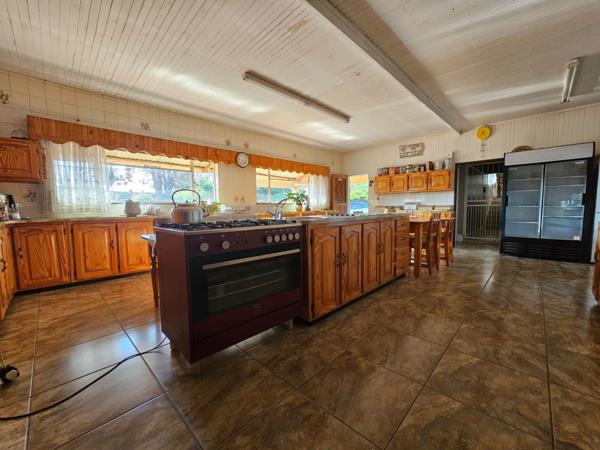 Main house consists of spacious living areas and a kitchen with wooden cupboards, a gas hob and eye-level oven.