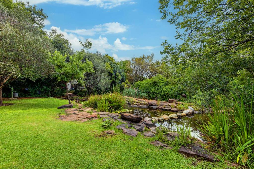 Outdoor living is exceptionally catered for with a private swimming pool, secured by a safety fence, and a covered patio ideal for al fresco dining. The property boasts a built-in braai, an outdoor brick oven, and a club house, perfect for hosting. The lush, mature gardens feature natural rock-lined ponds and an artificial waterfall, creating a serene oasis. Practical amenities include four garages, five additional parking spaces, staff quarters, and a wendy house.