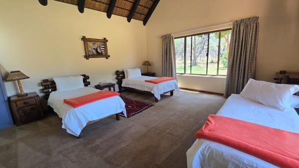 Improvements consist of and include a lodge with four En-Suite bedrooms, lounges, bar, recreation areas, conference room, industrial kitchen, large patio and swimming pool as well as a charming little chapel. A separate hunting camp with seven bedrooms, kitchen, ablution, braai boma and recreation area under thatch roof and at the large dam the two bedroomed chalet already mentioned.