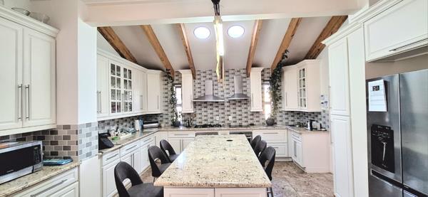 The open-plan living areas seamlessly connect the kitchen, dining room, and lounge, creating a warm and inviting flow. A built-in braai and large sliding glass doors open onto a beautifully landscaped garden ideal for year-round entertaining.