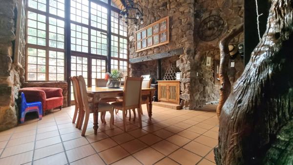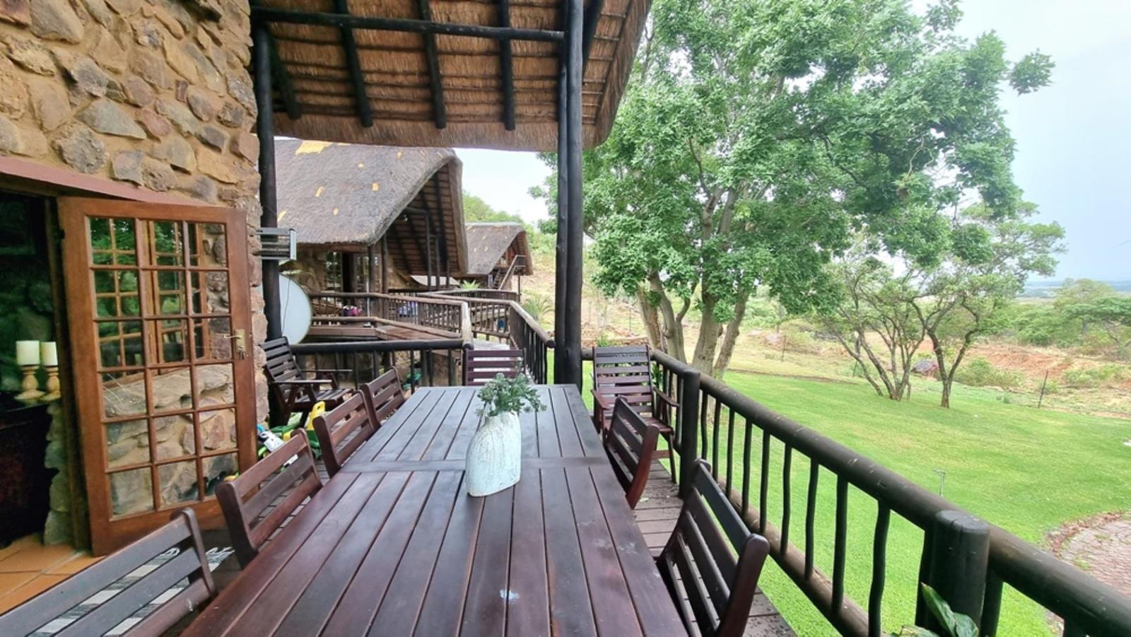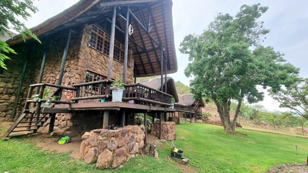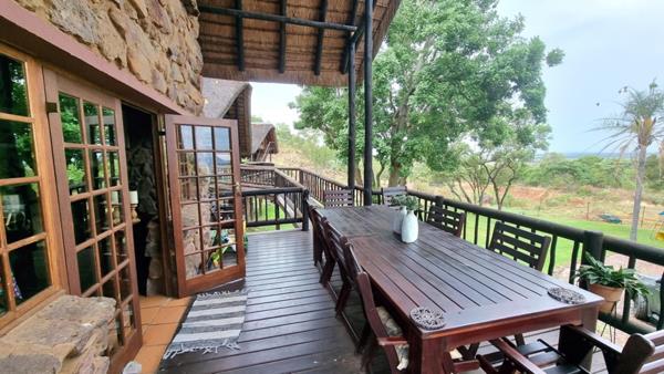 There is a guest Chalet which is also constructed from natural rock and thatch roofs which chalet is links via a wooden walkway to the main house. This chalet is a double storey with 2 x Bedrooms on the ground floor which shares 1 x bathroom. The upper stairs loft area is a 1 en-suite bedroom. This chalets patio is a wooden deck and there is a small outside self-catering kitchenette.