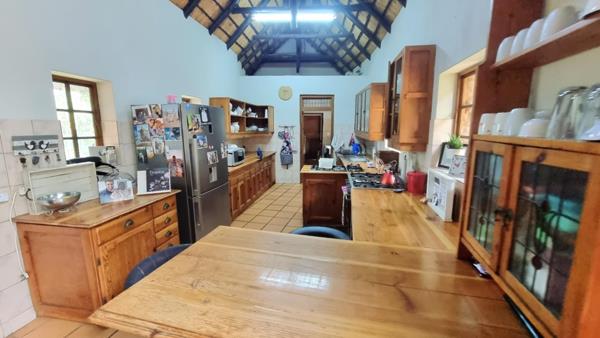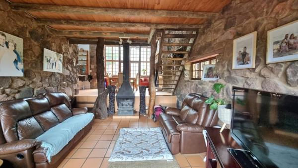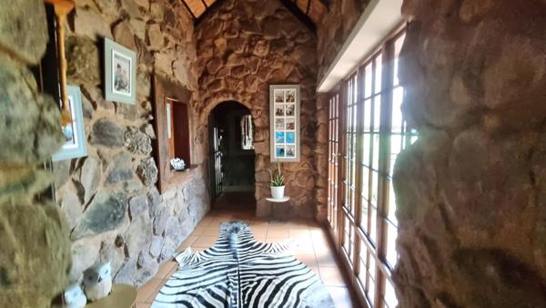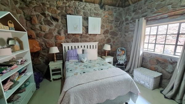 The main house is constructed from natural rock and thatch roofs. This is a 3-bedroom house with 2 bathrooms as well as a guest toilet. The house has a nice kitchen with both a scullery and a pantry. The lounge area has a cosy fireplace and there is a dining room area open plan and an office area study. The houses patio is a wooden deck.