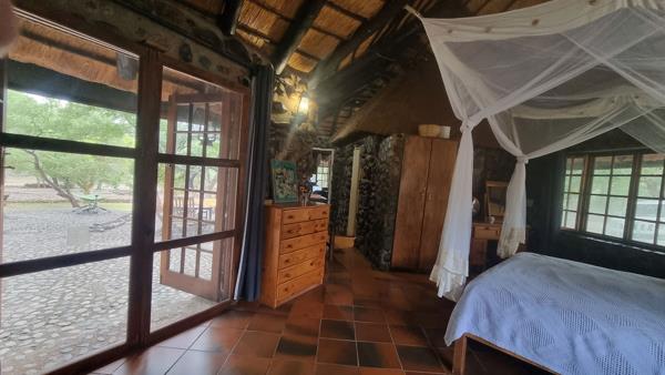 The homestead features two beautifully crafted cottages built from natural river stone and topped with thatched rooves, seamlessly blending into the landscape. Each cottage offers two comfortable bedrooms and a shared bathroom, perfect for family getaways or guest accommodation. One of the cottages boasts a spacious open-plan lounge and kitchen, ideal for relaxed, communal living.