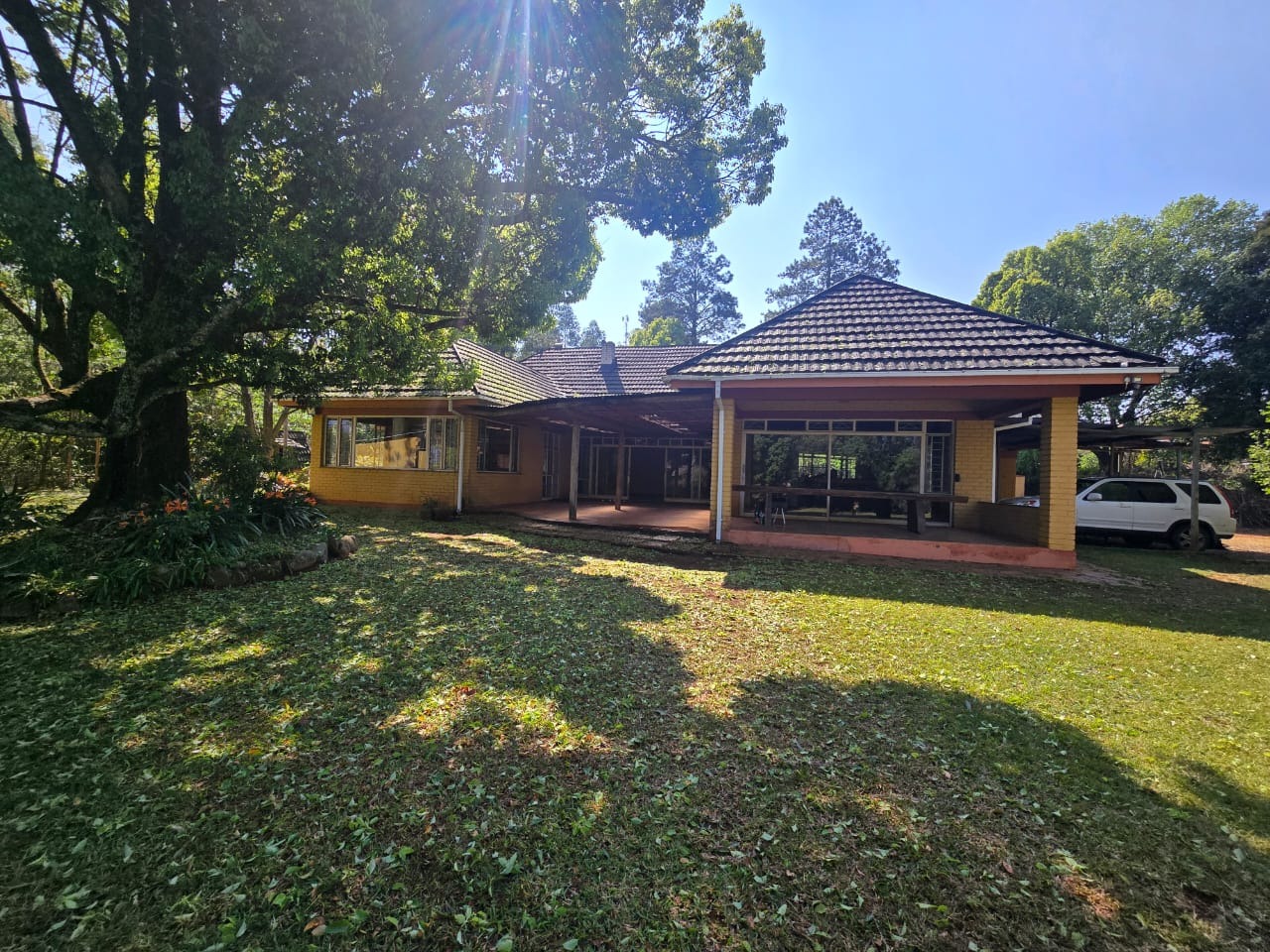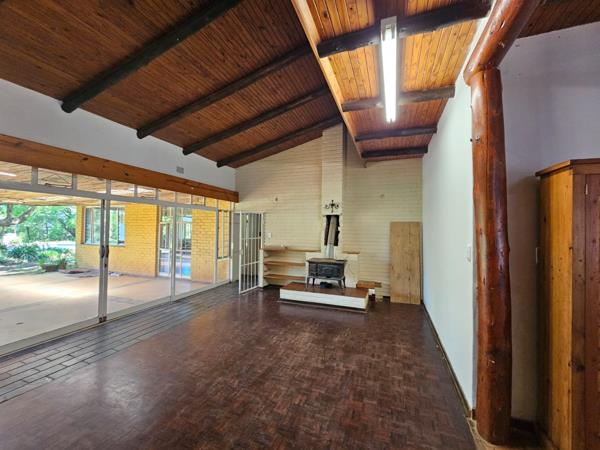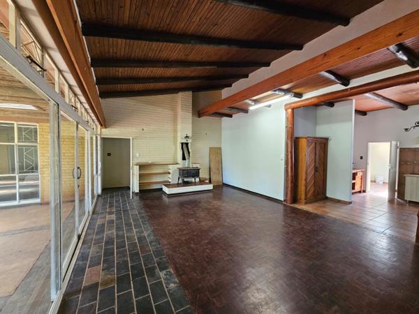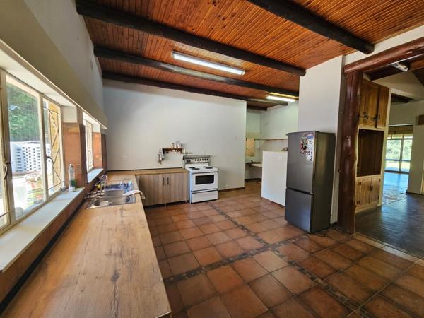 Discover a unique opportunity in the scenic town of Sabie, offering a substantial 1.30-hectare erf with immense potential. This property presents a canvas for renovation, allowing you to transform its existing rustic charm into a modern family haven. The exterior features a classic tiled roof, a spacious grassy yard with mature trees providing natural shade, and a large covered patio ideal for outdoor living and entertaining. A dedicated carport and two garages provide ample parking.