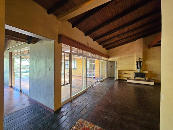 Step inside to find a home brimming with character, featuring high vaulted wooden ceilings and exposed beams that create an inviting, spacious atmosphere. The layout includes two generous lounges, one boasting a charming wood-burning stove, perfect for cozy evenings. Large glass sliding doors throughout the living areas ensure abundant natural light and offer seamless indoor-outdoor flow, leading to the garden and patio. The kitchen includes a practical pantry, ready for your personal touch.