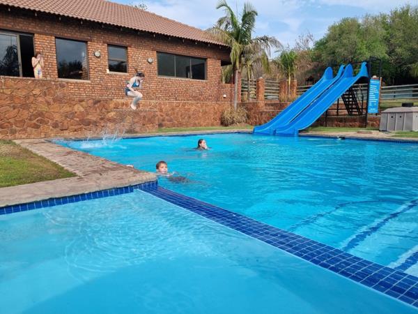 Large beautiful open swimming pool that is child-friendly and safe with two ablution blocks and accompanied by a kitchen.