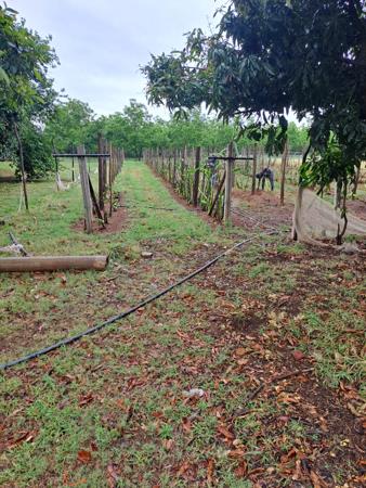Established fruit trees including mango, avocado, nuts, and dragon fruit