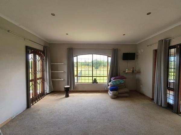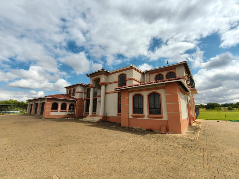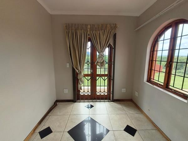 Further highlights include a pantry, laundry, scullery, expansive entertainment areas, three balconies with sweeping farm views, and a very large patio with a built-in braai overlooking the swimming pool. The pool area is secured with clear-view fencing, while the garden around the house is electric-fenced. The paved backyard includes three garages and three under-cover parking bays.