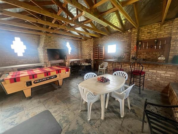 Outdoor living is a highlight, with a large garden area perfect for pets and outdoor activities. The property boasts a lapa and a built-in braai, creating an ideal setting for entertaining guests or enjoying South African evenings. Practical features include three garages for secure parking, staff quarters, a dedicated laundry room, and additional storage space.
