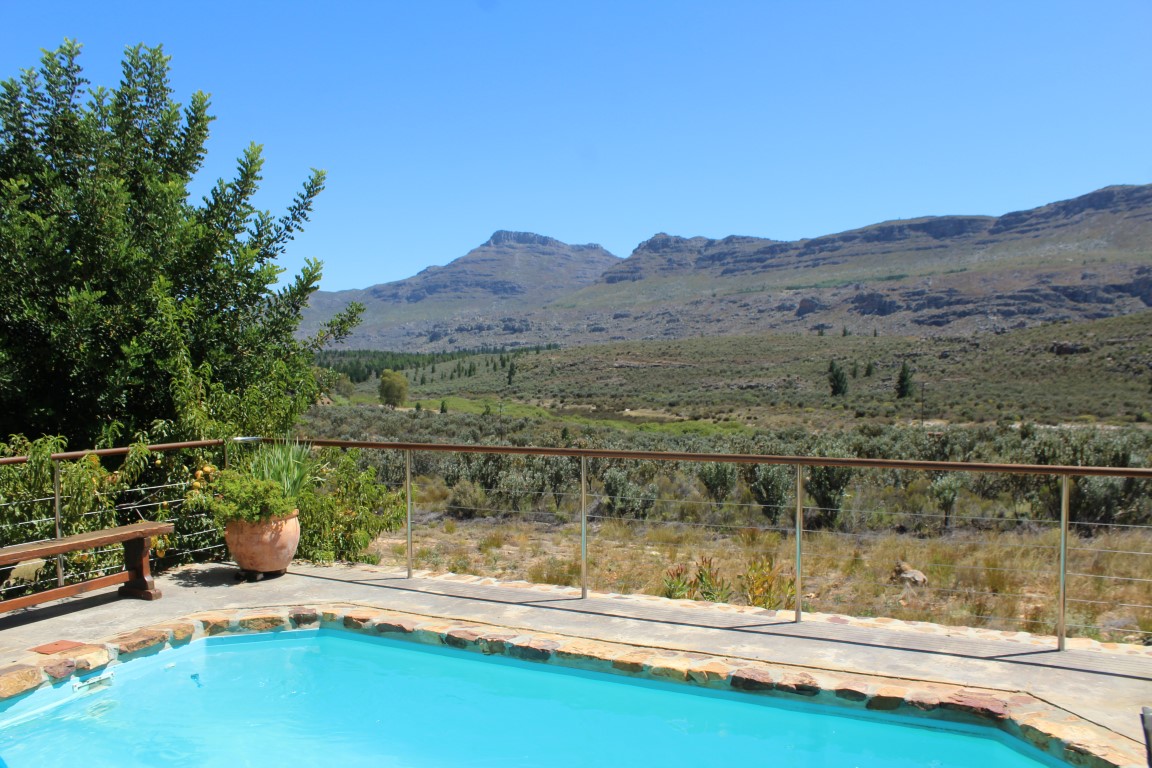 A covered stoep overlooks the sparkling swimming pool, river, and panoramic views over mountains in the distance. The sale includes most of the furniture and small appliances. The farmstead is fully linked for WIFI, and cell phone reception is adequate.