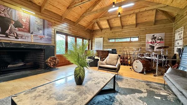 The main residence features two generous bedrooms and two well-appointed bathrooms. The living areas include an open-plan lounge and dining space with a wood-burning fireplace, a modern kitchen, and a separate, elevated study tucked among the treesperfect for working remotely or finding a bit of quiet focus. Additional lifestyle perks include a home cinema, a glass-fronted wine cellar, a dedicated music room, and outdoor entertainment spaces like a timber deck, pool, and hot tub.