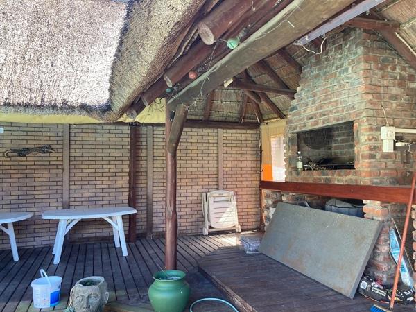 This home consists of a spacious lounge, dining room which leads into another room which can be used as a 4th bedroom, sun room or office, a huge size kitchen with a separate area for a breakfast nook, a tv lounge leading into a huge enclosed undercover entertainment lounge with a built in bar and braai which leads out a sliding door onto the beautiful pool area which has a thatched undercover lapa entertainment area with a built in braai and is fitted with roll up canvas windows that can be closed for bad weather, 3 bedrooms all with built in cupboards, 2 bathrooms, 1 which is an en suite bathroom with shower, toilet and basin, the main bathroom consists of a bath, shower, basin and toilet. There is an extra length garage where one can park 2 smaller cars and an undercover carport with enough space for 4 cars. There is also an outside room with a toilet.