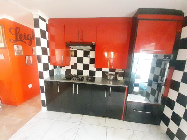 The kitchen is colourful and stylish, featuring ample built-in cupboards, a fitted stove with extractor fan, and great counter space. It also includes a walk-in pantry, offering excellent storage for groceries and appliances a fantastic bonus for any home chef.