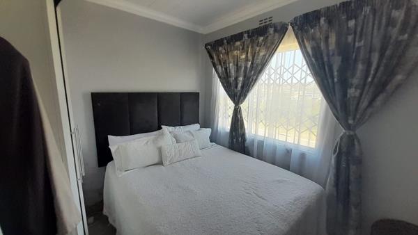 This neat property offers two well-sized bedrooms with built-in cupboards, one bathroom, and an open-plan lounge and kitchen. Additional features include a solar geyser and burglar proofing on all windows, as well as a security gate for added peace of mind.
