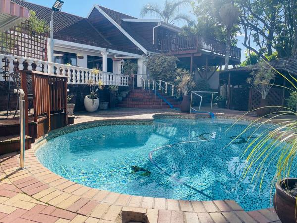The property offers excellent entertainment spaces, both inside and out, set within a large, beautifully landscaped garden adorned with palm trees, a lapa, and a sparkling pool. It includes a double garage and covered parking for up to six vehicles.