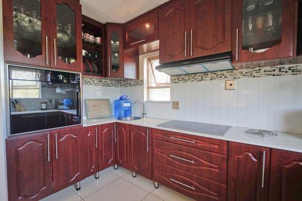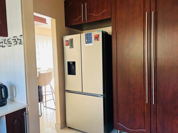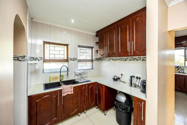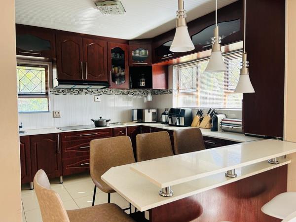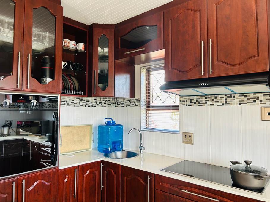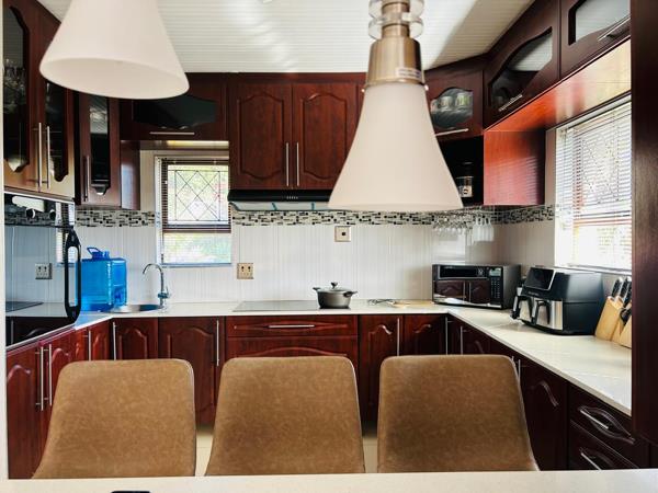 This spacious family residence is designed for comfort and can accommodate a large family. Upon entering, you will find an open living and dining area filled with warm light from the large windows, complete with an air conditioning unit. The modern kitchen includes a separate scullery and laundry room, leading into a second living area with its own dining space, making it ideal for family gatherings.