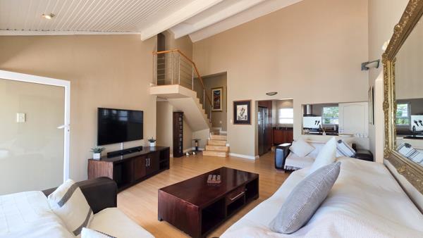 Stacking doors spill out to a covered entertainment area with a built-in braai, overlooking the sparkling pool and tranquil river vistas the ideal backdrop for summer afternoons or sunset gatherings.