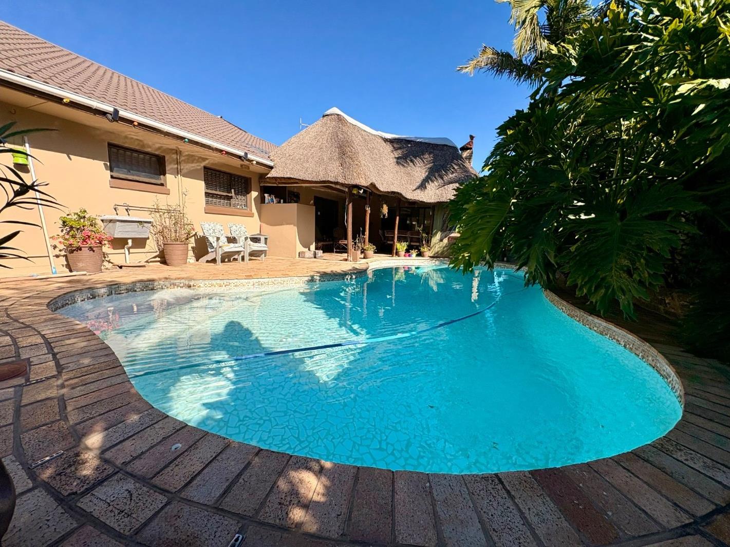 Step outside to a stunning covered braai space, complete with a built-in braai and a guest braai all overlooking a beautifully maintained swimming pool, making it the perfect spot for gatherings and summer days.
