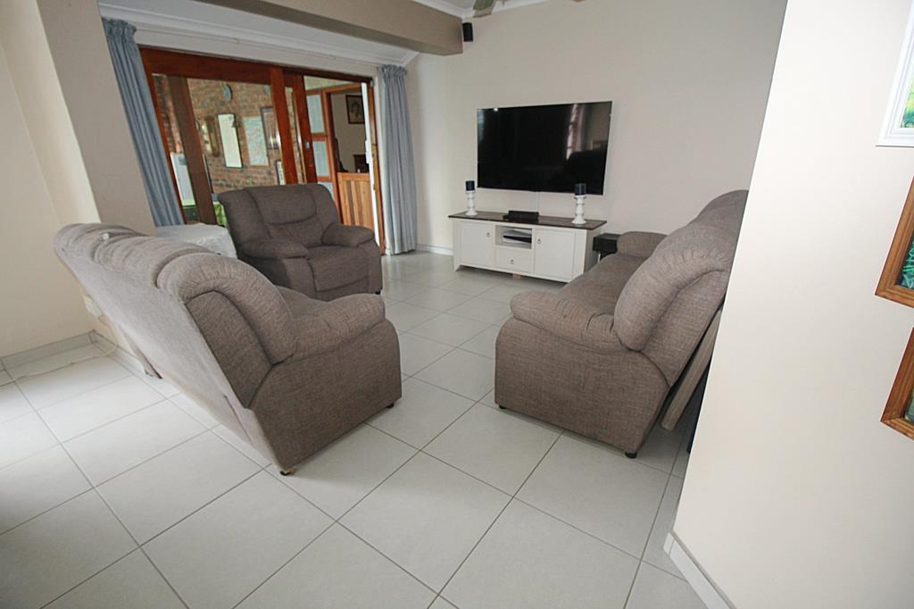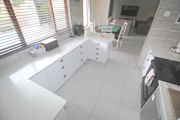 The main residence features a bright, open-plan living area that combines the lounge, dining room, and kitchen into a welcoming space. The kitchen is beautifully appointed with Caesarstone countertops, ample cupboard space, and a separate scullery for added convenience. Sliding doors from the lounge lead to an enclosed braai and entertainment area, which seamlessly connects to a sparkling poolperfect for family gatherings and entertaining guests.