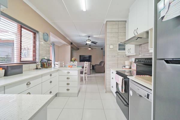 Down the hallway, youll find three beautifully kept bedrooms, all tiled and equipped with ceiling fans and built-in cupboards. The main bedroom offers a touch of luxury with its full en-suite bathroom, while the remaining two bedrooms share a pristine family bathroom.