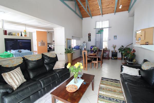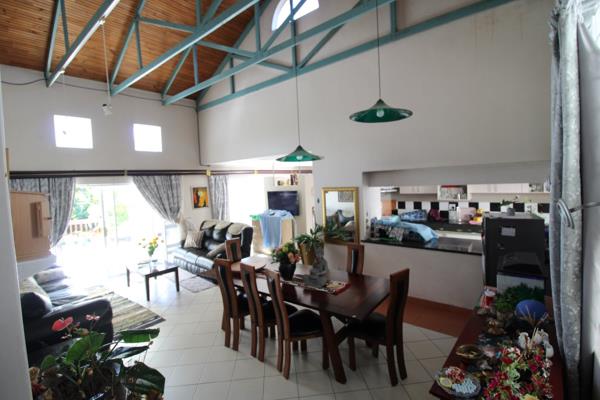 Airy open-plan lounge with exposed trusses, plus a second lounge and dining area with sliding doors leading to a partly covered patio overlooking a neat garden.
