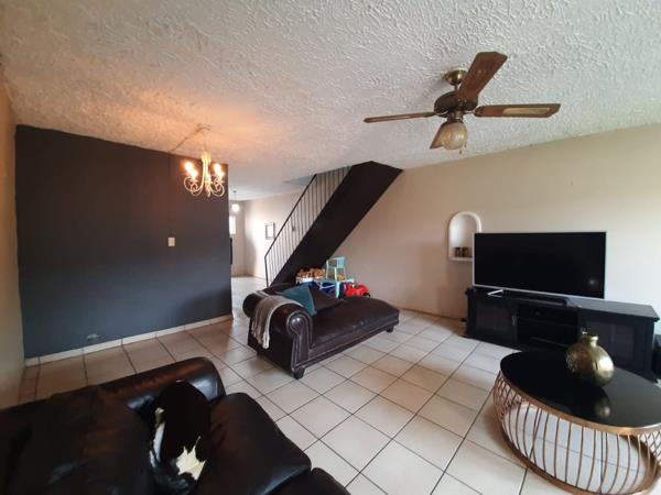 This sectional title town house is located in a secure complex with a remote controlled access gate, paved driveway, open parking and single garage. Next to the garage and front door entrance is a private courtyard whilst the private garden and braai area can be accessed from the lounge. The dining room, lounge and kitchen is downstairs and upstairs are 3 bedrooms and a bathroom. The main bedroom has a shower cubicle.