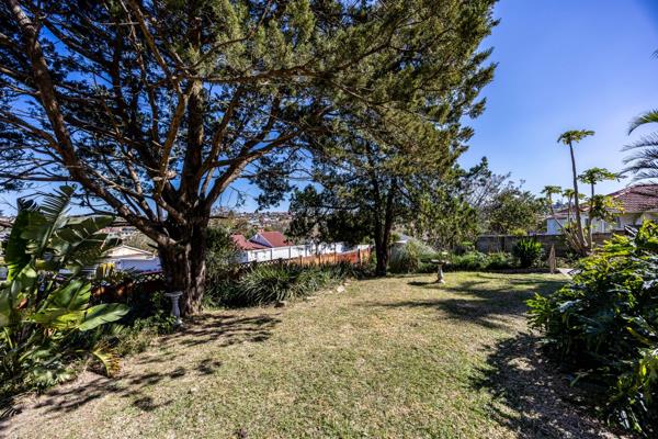 Garden: Mature trees and a gentle slope create a tranquil outdoor setting.