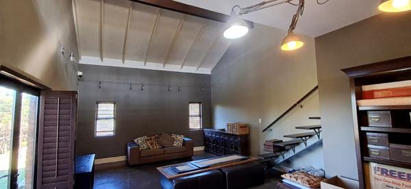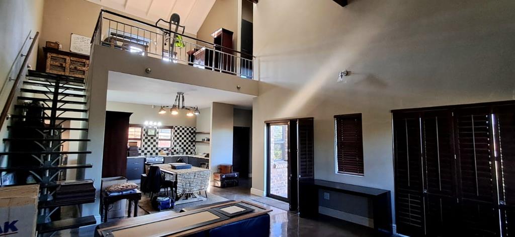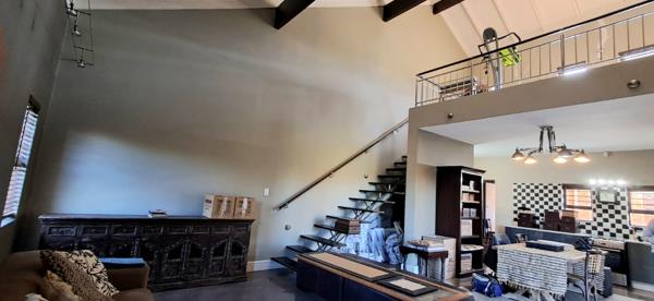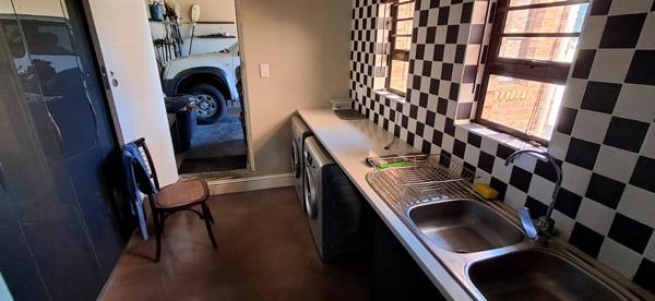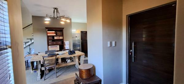 Upstairs, the main bedroom offers a balcony, built-in mirror cupboards, and an en-suite bathroom. The entire home has durable epoxy flooring. Additional features include a double garage with direct access, an outside courtyard, two 5000-liter water tanks with a pump, and a solar geyser.