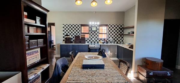 The home includes a dedicated work-from-home office. The open-plan kitchen has a gas stove, and a separate laundry/scullery with a pantry is located under the staircase. The lounge and dining area open onto a patio, ideal for entertaining.