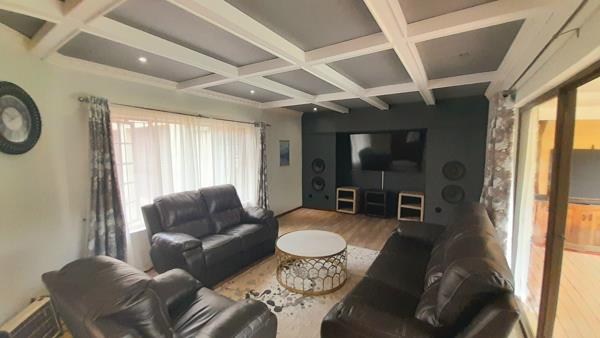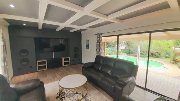 The property provides a spacious lounge with laminated floors, built-in speakers, and sliding doors opening onto an inviting entertainment area with a sparkling swimming pool and braai.