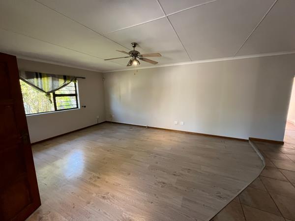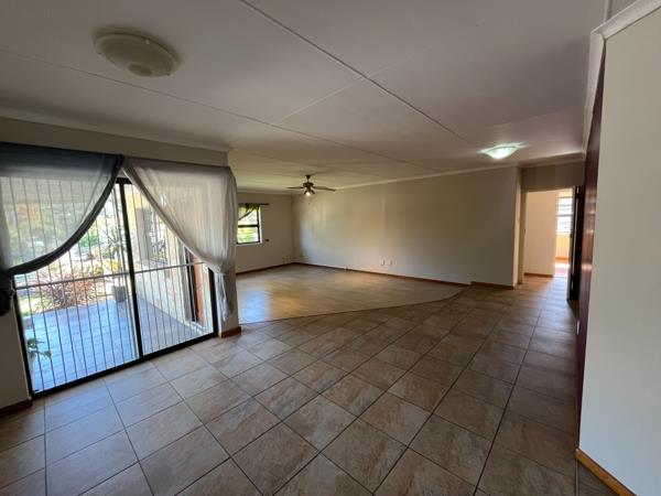 The home welcomes you with a spacious open-plan lounge and dining area flowing into a modern kitchen with a separate scullery. A family/TV room opens out onto a thatched lapa with built-in braai, ideal for relaxed family gatherings and entertaining friends.