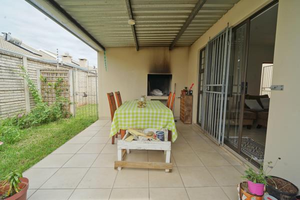 This home features two well-sized bedrooms, providing a restful retreat, and a bathroom with modern finishes. The living space extends outdoors with a covered patio, complete with a built-in braai perfect for enjoying sunny days and hosting gatherings.