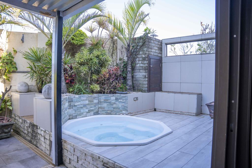 Perfect for entertaining, the outdoor area boasts a gas braai and a private jacuzzi pool. The modern kitchen is a chefs dream, complete with granite countertops, a gas and electric hob, and ample workspace.