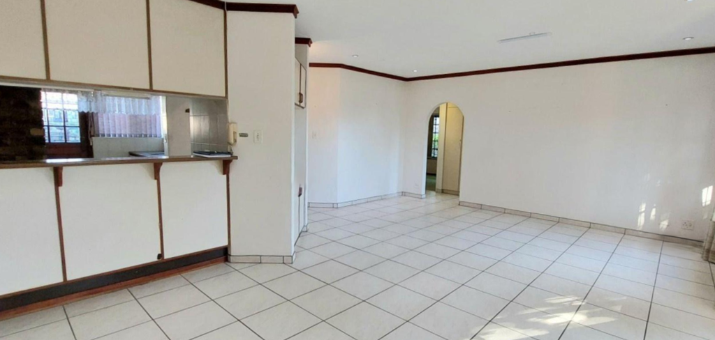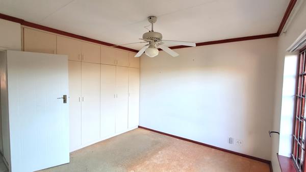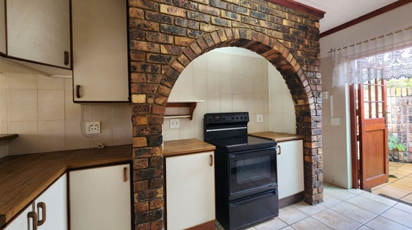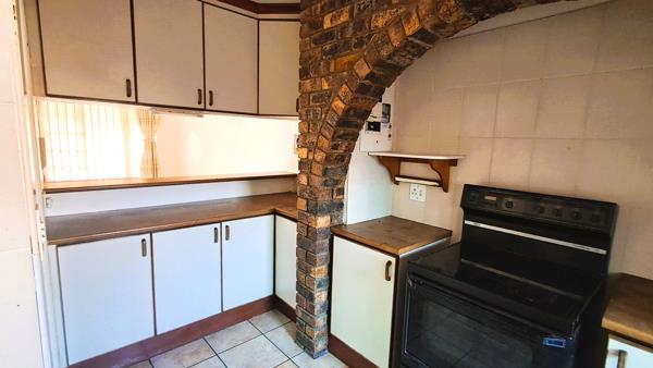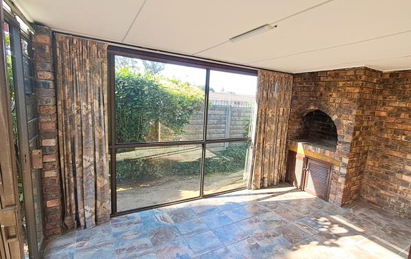 When entering, you are greeted with a spacious open-plan dining and living area with an aircon that flows into a covered patio with a built-in braai, creating the ideal space for entertaining friends or relaxing. The kitchen has a free stranding stove and the backdoor opens to an enclosed patio with a washing line.