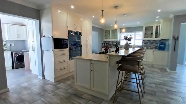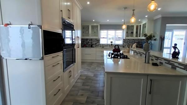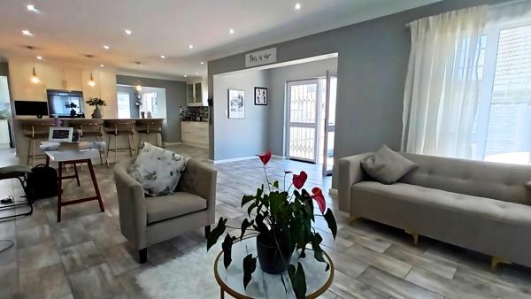 The heart of the home is a stunning open-plan kitchen with a breakfast counter where the family can gather. Its beautifully fitted with an eye-level oven, gas hob, and separate scullery ideal for anyone who loves to cook and entertain. The living area flows effortlessly from the kitchen to the lounge and out through patio doors to the pool and braai area, creating the perfect space for relaxed coastal living.
