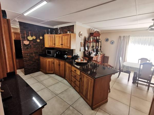 As you walk through the main entrance of this immaculate home you are immediately welcomed by the tidiness of the front yard displaying the perfect manicured little flower bed near the front door. The main home has so much to offer from the main lounge with a sliding door leading to a patio, kitchen with granite counter tops, solid oak cupboards, 2 eye level ovens, loads of packing space and a separate scullery with all the laundry fittings, dining room leading to a second lounge with a sliding door onto the lapa/braai area. This impressive home has 4 bedrooms of which 3 has sliding doors to a patio, the main bedroom has a walk in closet and small lounge area. The 2 bathrooms are just gorgeous.