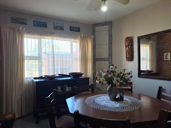 Outdoor living is a delight with a private, fenced backyard featuring high brick walls for seclusion. This space includes a built-in braai, perfect for entertaining, and an established garden. From certain vantage points, residents can enjoy scenic distant ocean views and overlook a sprawling green golf course, adding to the property''s appeal. Security is enhanced with a security gate and robust fencing, while pets are welcome, making this a truly family-friendly environment.