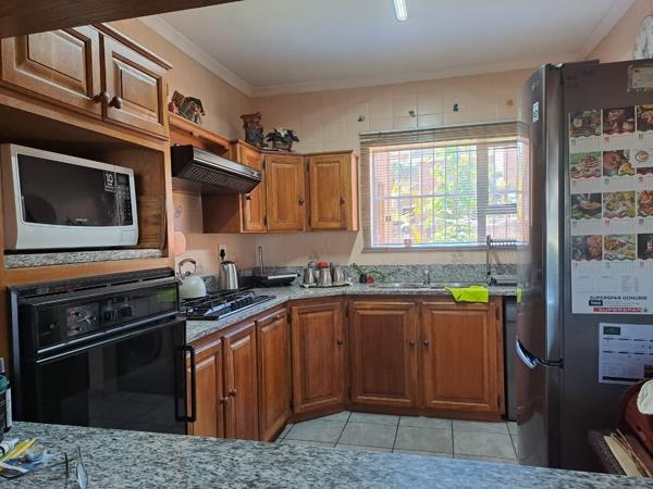 Discover this charming two-story brick townhouse, ideally situated in the coastal and suburban complex of Gonubie, East London. The property immediately impresses with its well-maintained front garden and durable brick exterior, complemented by an integrated garage and an energy-efficient solar water heater. Step inside to an inviting open-plan living space, where a distinctive brick archway seamlessly connects the lounge and dining areas. The kitchen, a functional heart of the home, boasts ample wooden cabinetry, granite-look countertops, and built-in appliances including an oven, gas hob, and microwave, all designed for practical living.