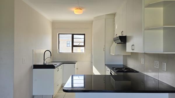 The apartment offers two bedrooms, both fitted with built-in cupboards, and a full bathroom featuring a bath and shower. The open-plan kitchen and lounge create a warm, inviting flow, with the kitchen boasting granite countertops, an under-counter electric oven, and hob. The lounge extends through a glass sliding door onto a private balcony ideal for relaxing or enjoying your morning coffee.