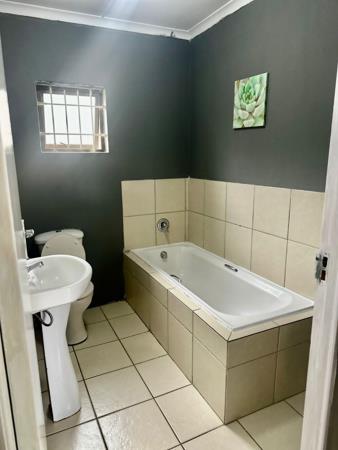 The three bedrooms provide ample accommodation, with some featuring modern wood-look laminate flooring and others maintaining the clean tiled finish. Walls are painted in various shades of grey, offering a contemporary feel. The two bathrooms are functional, each including a bathtub, toilet, and pedestal sink, with tiled floors and lower walls for easy maintenance. Natural light filters through windows, many of which are fitted with security bars for added safety.