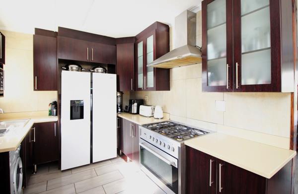 The contemporary finishes throughout the home are complemented by a stylish kitchen featuring built-in cupboards, sleek Caesar-stone countertops, a convenient washing machine point, and a gas stove for the discerning chef.