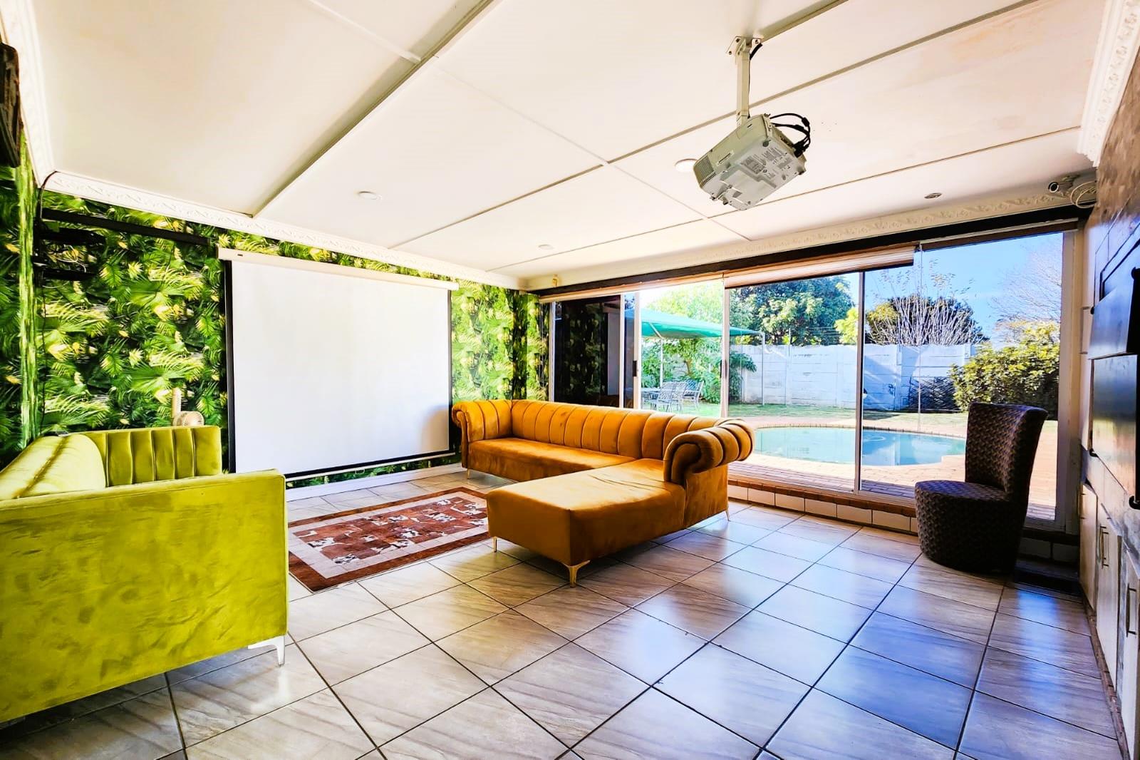 The property features two spacious lounges, one inviting area for guests and a spectacular entertainment lounge designed for cinema-style viewing, complete with a built-in braai and a designated bar for entertaining friends and family.
