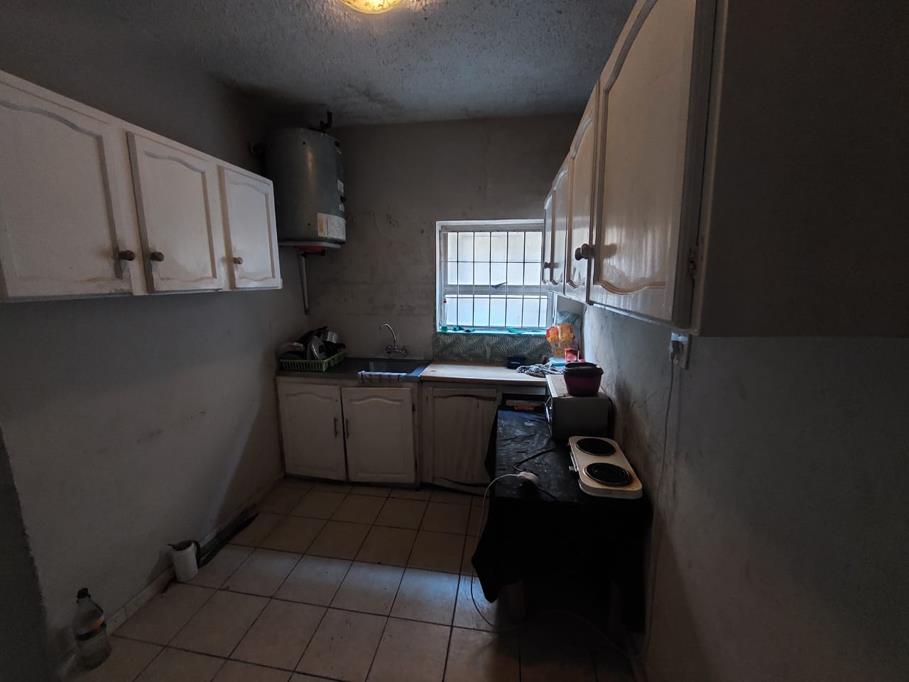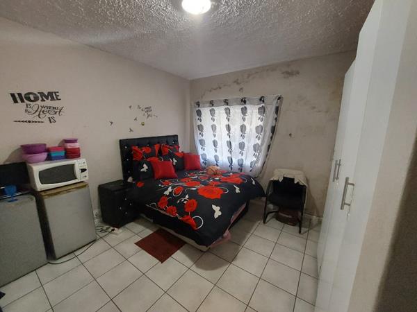 This cozy residence features a well-appointed bedroom with built-in cupboards, a bathroom complete with a bath, basin, and toilet, as well as an open-plan lounge and dining area. The separate kitchen adds convenience and functionality.