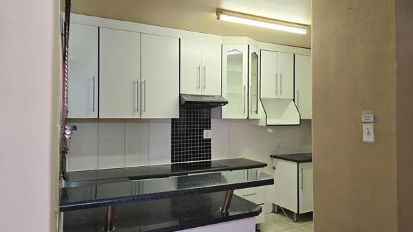 The kitchen is functional and tidy, with ample built-in cupboards and easy access to the living area.