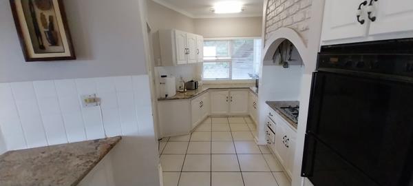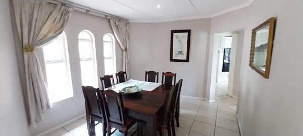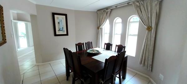 The kitchen is equipped with granite countertops, ample built-in cupboards, a gas stove, two eye-level ovens, space for a double fridge, and a double sink. A dedicated dining area just off the lounge and kitchen makes family meals and dinner parties a breeze.