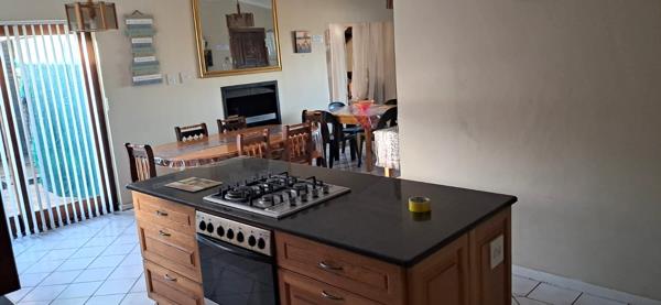The open-plan kitchen flows into the dining area, lounge, and indoor braai space, creating a perfect setting for entertaining.