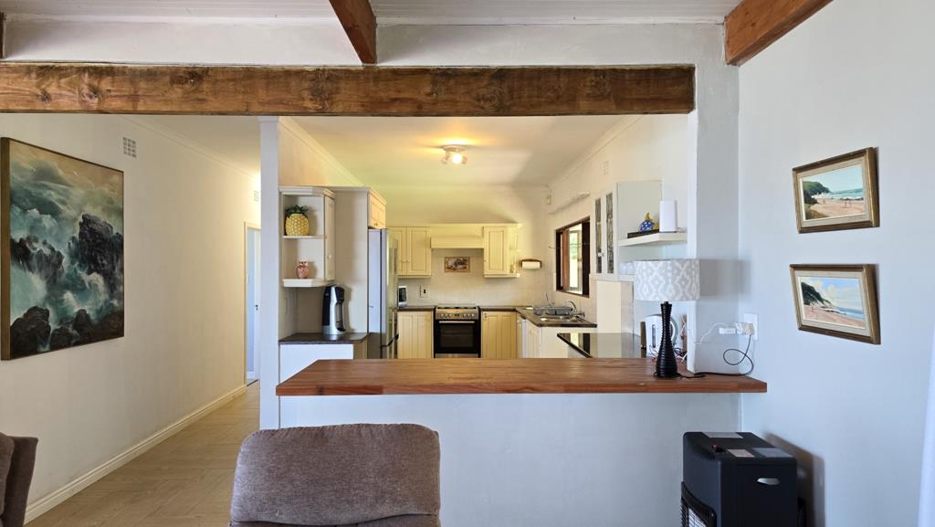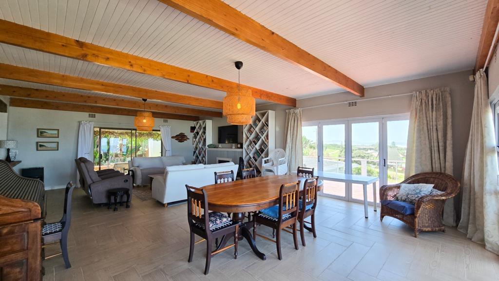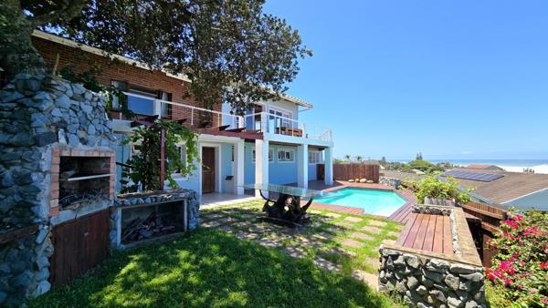 This luxurious, modern, open-plan home is perfect for family living and entertaining. It has a charming garden cottage, ideal for guests or additional income, as well as a games room near the swimming pool. In all consists of 5 spacious bedrooms, 3 bathrooms and an open plan lounge, dining area and modern kitchen. Lounge and dining area have stackable doors on two sides leading on to a wrap around deck with the most amazing seaviews. The lounge is very homely and has a cosy fireplace. Beautiful trees for shade, wooden deck surrounding the pool and braai area amongst the shrubs/trees creating a wonderful holiday atmosphere. Nestled in a serene location, this property is designed for those who appreciate style, space, and the beauty of coastal living.