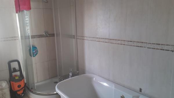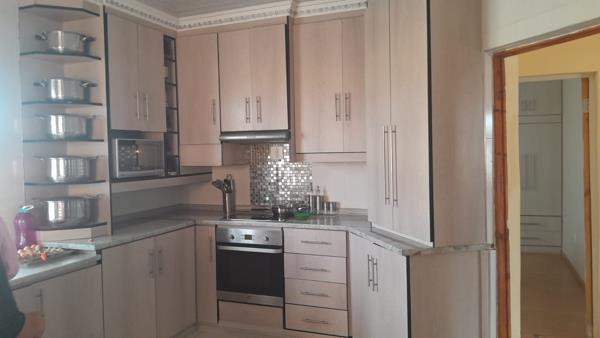 This property features a spacious four-bedroom house with a kitchen and two bathrooms. Each room is equipped with built-in cupboards, offering ample storage space. Additionally, the house includes a charming corner unit with built-in cupboards. The outside grounds are paved, and both the double garage and gate are automated.